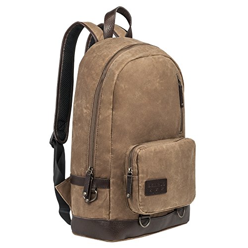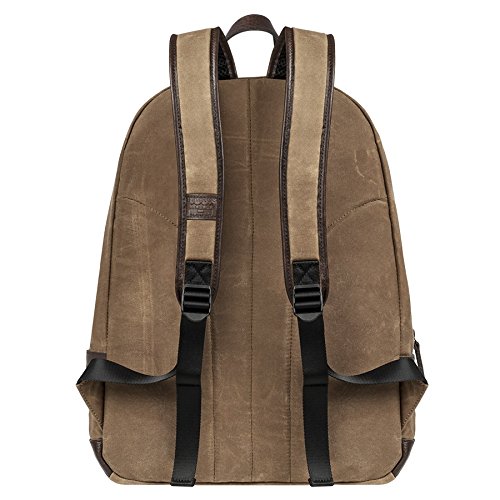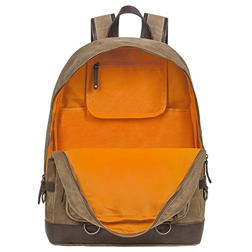 This military-inspired waxed canvas backpack with genuine top grade leather trim is the perfect size for mission essentials. Interior details include a bright safety orange lining, a padded laptop sleeve and storage pocket. Padded ergonomic straps are contoured for extra comfort and a large exterior pocket is easily accessible to provide extra storage. Antique brass finish hardware gives this modern backpack a true vintage feel. Available in Brown and Chestnut, Black and Olive, Khaki and Cognac, and Black.Feature