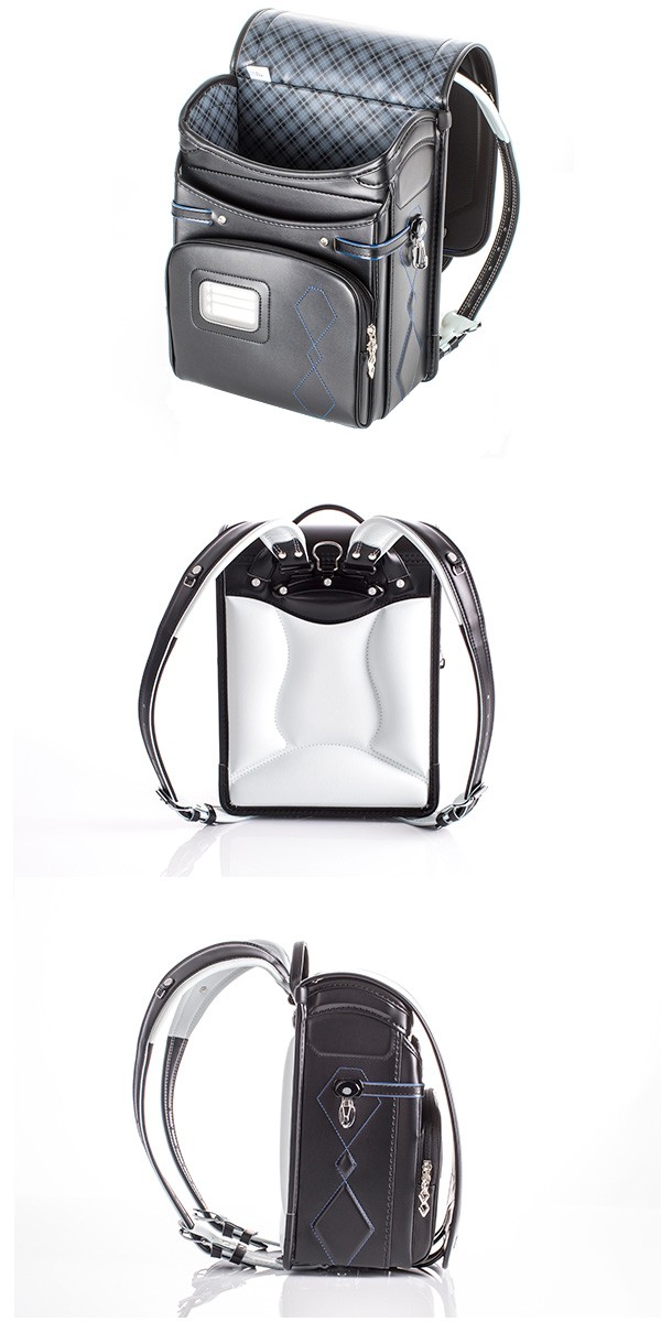 肩ベルト:ふわりぃ仕様、長尺:9穴、右/Dカン、左/Dカン、鋲:エンブレム、錠前:ワンタッチロック、ナスカン:反射材付、ラクラクナスカン、補強:ガッチリガード、冠裏:グレーチェック、内装:グレーチェック、ポケット:ワイドポケット、Dカン付、反射材:(冠下部・前締め・肩ベルト)、持ち手あり、カラー:ブラック×スパークブルー