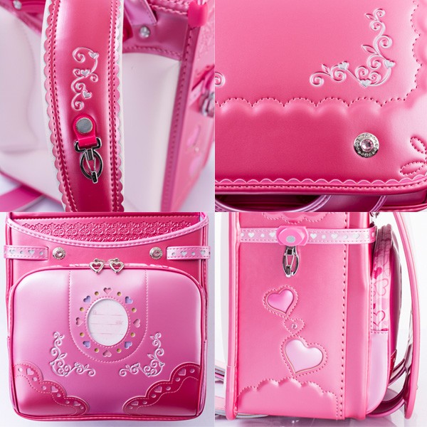 内装:ピンクドット、錠前:ワンタッチロック、補強:ガッチリガード、ポケット:ワイドポケット・内装総内張り・小ナスカン付、肩ベルト:ふわりぃ仕様・長尺・9穴・フリル型・箔押し・右(ハートカン)・左(小ナスカン)、鋲:クリスタルサークル、ナスカン:反射材付、冠裏:レース&ドット、反射材:冠下部・前締め・肩ベルト、固定型持ち手、カラー:パールビビットピンク×パールピーチ