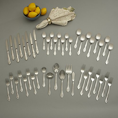 - Service for eight (dinner fork, dinner spoon, salad fork, teaspoon, dinner knife) and 6 serving pieces (serving spoon, slotted serving spoon, gravy ladle, serving fork, butter knife, sugar spoon)