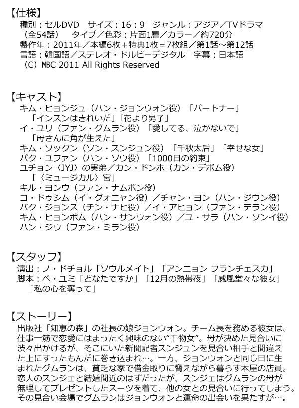 お金持ちの娘として何不自由なく育ってきたジョンウォン(キム・ヒョンジュ)と、貧乏な家で借金取りに脅えながら生活してきたグムラン(イ・ユリ)。同じ日に生まれ運命を取り違えられた2人とその家族たちの愛、葛藤、決断、復讐を描きだす波乱万丈ストーリー!!主人公の干物女ジョンウォンを2年ぶりにドラマ復帰したキム・ヒョンジュが熱演し大絶賛!!回を追うごとに高視聴率をマークし、放送回数も延長された韓国ドラマの最高傑作!! |