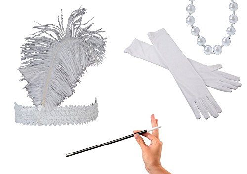 This is a Jazz 1920s Costume Bundle .Includes 1 White Ostrich Feather Headband, , 1 White Bead necklace, 1 Pair Long White Gloves, 1 Long Cigarette Holder. Cigarette Holder is 13 1/4" long, gloves are 21" long, head band is one size fits most. White Bead Necklce is 60" long and 8mm wideFeature