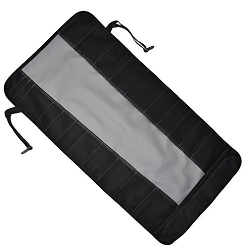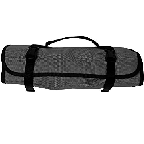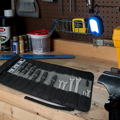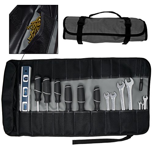 Strong and durable, ideal for home use and professionals alike. Measures approximately 27.5" length by 14.25" wide overall. Features 22 graduated slots for various tools, 3 Velcro closure smaller pockets, and buckle closure.