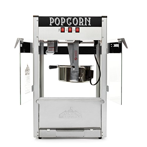 TOP QUALITY: Fashioned with authentic antique style updated with modern features, this attractive popcorn machine offers visual appeal and lasting durability. Constructed of heavy-duty stainless steel, 850 watts of power, and premium paint with a glossy finish, this 12-ounce kettle can produce about 5-gallons of popcorn per batch to satisfy large crowds.