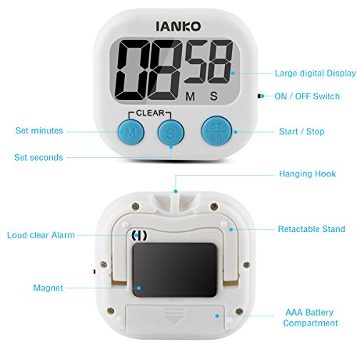 iAnko Digital Kitchen Timer- Magnetic Back and Retractable Stand -Large LCD Display Bold Big Font-Minute Second Count Up-down Timing device