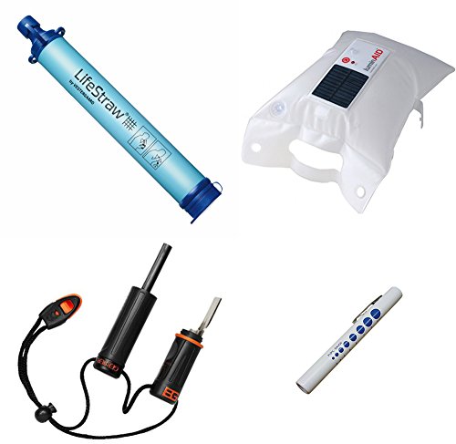 LifeStraw Personal Water Filter - 4-pc Survival Bundle w/ Luminaid Packlite 16 Inflatable Solar Lantern + Gerber Bear Grylls Fire Starter + Pen Light