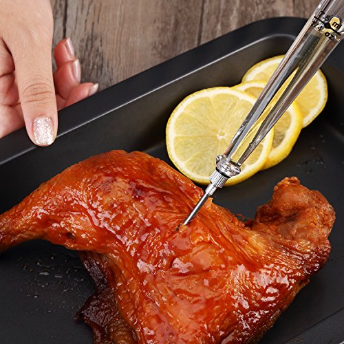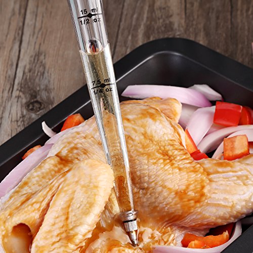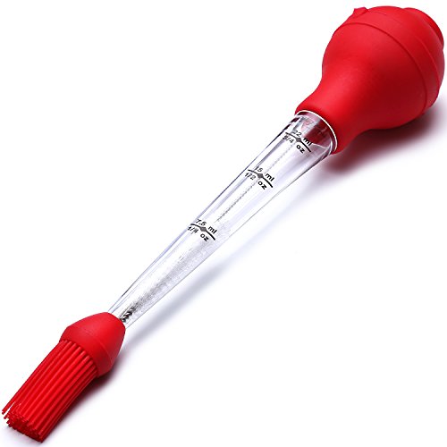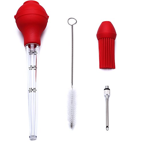 INTRODUCING THE CHEF REMI 3-IN-1 BASTING SET WITH CLEANING BRUSH The ultimate tool for adding delicious flavor to meat, roasts, BBQs etc. The secret to succulent roasts is regular basting and marinating during cooking. 3-in-1 tool bastes, brushes on sauces and injects marinade deep inside roasts for the ultimate flavor punch. . Basting tube sucks up meat juices, butter etc from the roasting pan to drizzle over food. . Detachable basting brush to brush on thick sauces. . Screw-on meat injector needle to pierce meats for deep penetration of marinades. Why Is This The Best Turkey Baster Syringe? . Food grade silicone bulb creates a powerful suction to suck up even heavy marinades and juices. Yet is soft and you can squeeze out marinade from any angle. . Bulb has an innovative strong grip, which means it will never fall off basting tube during use, unlike inferior models. . PP plastic tube can hold hot liquids (heat resistant to 320°F) without warping, melting or cracking, even at high temperatures. Does not become dangerously hot, unlike metal or stainless steel tubes! . Built in stand allows you to stand tool upright in between basting sessions. Will not drop marinade and mess up countertops. . Measurements etched into the clear tube in both milliliters and fluid ounces. . Small, sharp, stainless steel injector needle easily pierces meats without damaging roast or dish. . Soft, silicone brush distributes just the right amount of sauce for perfect coverage every time. . Simple to clean, just rinse or throw all 4 pieces into dishwasher. All parts easily detach, and included cleaning brush will remove every drop of liquid left in the basting tube. . Total length 10.5 inches. Capacity ¾ oz / 22 ml. Chef Remi Design, Chef Remi Crafted.- WHEN QUALITY MATTERS! We offer a LIFETIME GUARANTEE not like our competitors. Try us, RISK FREE! 0 |