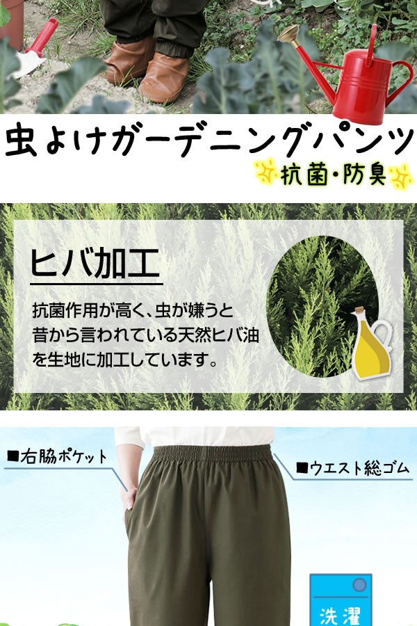 | ガーデニングや家庭菜園に!抗菌作用が高く虫が嫌うと昔から言われているヒバ油を生地に加工しています。もんぺ感覚でゆったり穿ける、流行のジョガーパンツ型。虫よけ/ガーデニング/園芸/家庭菜園/パンツ/抗菌/防臭/SEK/洗濯可/ヒバ/裾ゴム/はきやすい/カーキ/ジョガーパンツ/もんぺ/日本製 |