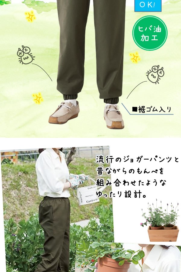 | ガーデニングや家庭菜園に!抗菌作用が高く虫が嫌うと昔から言われているヒバ油を生地に加工しています。もんぺ感覚でゆったり穿ける、流行のジョガーパンツ型。 |