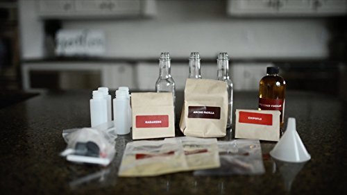- AUTHENTIC HOT SAUCE KIT: Makes 7 bottles of lip smacking gourmet hot sauce right from home. It contains, 3 Glass Woozy Bottles, 4 Squeeze Bottles, a 2-inch funnel, an Apple Cider Vinegar bottle, a zipped pouch of Spice Blend, 2 pairs of gloves, 5 pH strips. Also, 3 woozy reducers, 3 black caps, 4 squeeze bottle tops with red cap, Ancho Pasillas, Chipotle and Habanero Pepper bags – instruction card, an open/close pouch of Ghost Pepper & 7 label stickers.