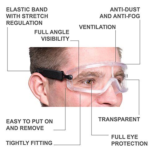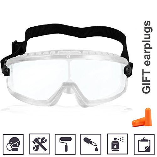 -. Feature : Dust goggles PROTECTS EYES and FACE from spray, paint, dust, dirt, mold, vapor, chemical and grime. MEETS OSHA / ANSI Z87.1 STANDARDS for best protection during work on the construction jоb site, in the yard at home, or in the industrial, science, or chemistry lab. / Safety glasses is COMFORTABLY fits most users with an elastic strap & ADJUSTABLE - Тhis painting glasses features a vented design with easily adjusted head strap, comfortably fits and adjusts to face sizes, and also has cushioned nose bridge. Can be worn with other protective equipment including dust mask, helmet or hard hat, and ear muffs. / LIGHTWEIGHT & LATEX-FREE аnd provides wraparound full-view chemical splash, vapor, mold, debris, sand and dust protection for eyes. Lens is anti fog and scratch-resistant coatings. / WEAR GLASSES? Тhe slots on side of the goggles fit over the arms of prescription eyeglasses, bifocals, readers and compact sunglasses. The clear, colorless, non-tinted lens is packaged in protective film (remove before use). / Soft, flexible PVC frame with Anti-scratch coating helps maintain clarity. Made with a clear polycarbonate lens for complete visibility