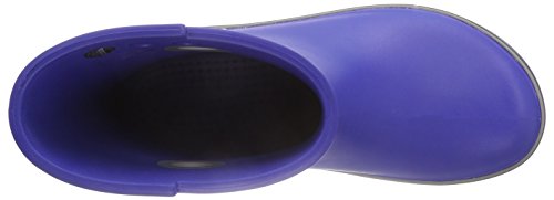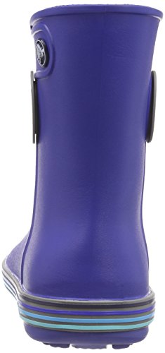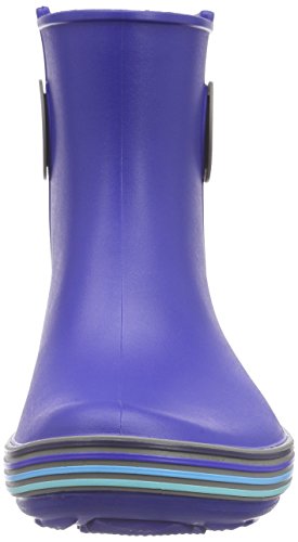 Round-toe rain boot featuring multicolored stripes around midsole and round pull holes at sides
