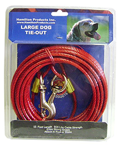 -. Binding : Misc. -. Brand : Hamilton -. Color : Value not found -. EAN : 0013227504688 -. Feature : All hardware is strength-tested to exceed industry standards / Extra Strong Snaps / Can be used with S18STAKE tie out stake or secured to a post -. Label : Hamilton Animal Products LLC -. Manufacturer : Hamilton Animal Products LLC -. Model : H15CABLE RD -. MPN : H15CABLE RD -. PackageQuantity : 1 -. PartNumber : H15CABLE RD -. ProductGroup : Pet Products -. ProductTypeName : PET_SUPPLIES -. Publisher : Hamilton Animal Products LLC -. Size : Value not found -. Studio : Hamilton Animal Products LLC -. Title : Hamilton Heavy Weight 15-Feet Plastic Coated Large Dog Tie Out Cable -. UPC : 013227504688
