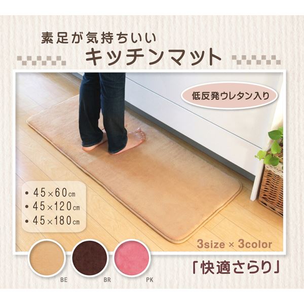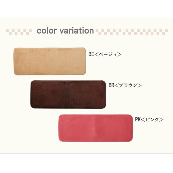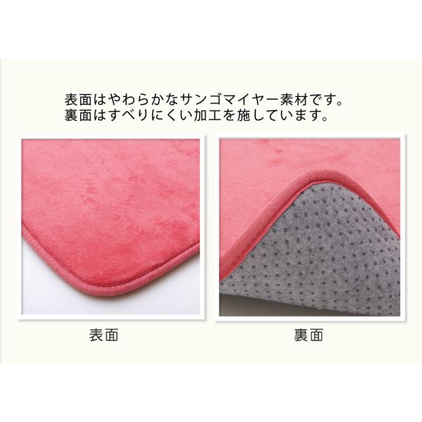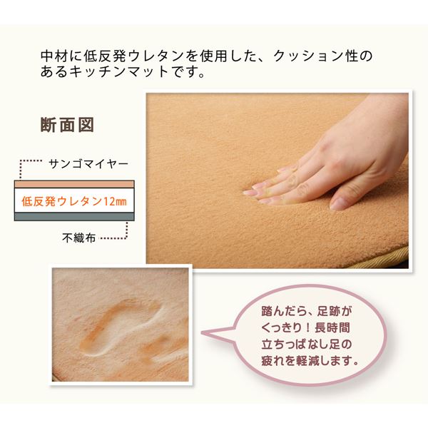 無地のシンプルなキッチンマットです。選べる3色展開です。表面にはさらっとした肌触りのサンゴマイヤーを使用しています。中材には低反発ウレタンフォームを使用しているため、ふっくらと柔らか踏み心地の商品です。裏面には滑りにくい加工を施しています。