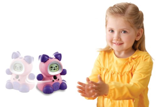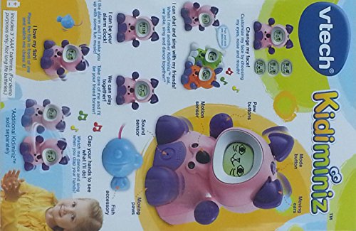 -. Feature : Choose from three sets of eyes, three mouths, and three noses to create a customized face / Recognizes and interacts with another Kidiminiz friend by talking, singing a duet, and playing together / KidiCat functions as a real clock and alarm / Detects and chases the included carrot play piece, clap your hands to activate movements, singing, and dancing / Says over 25 different phrases
