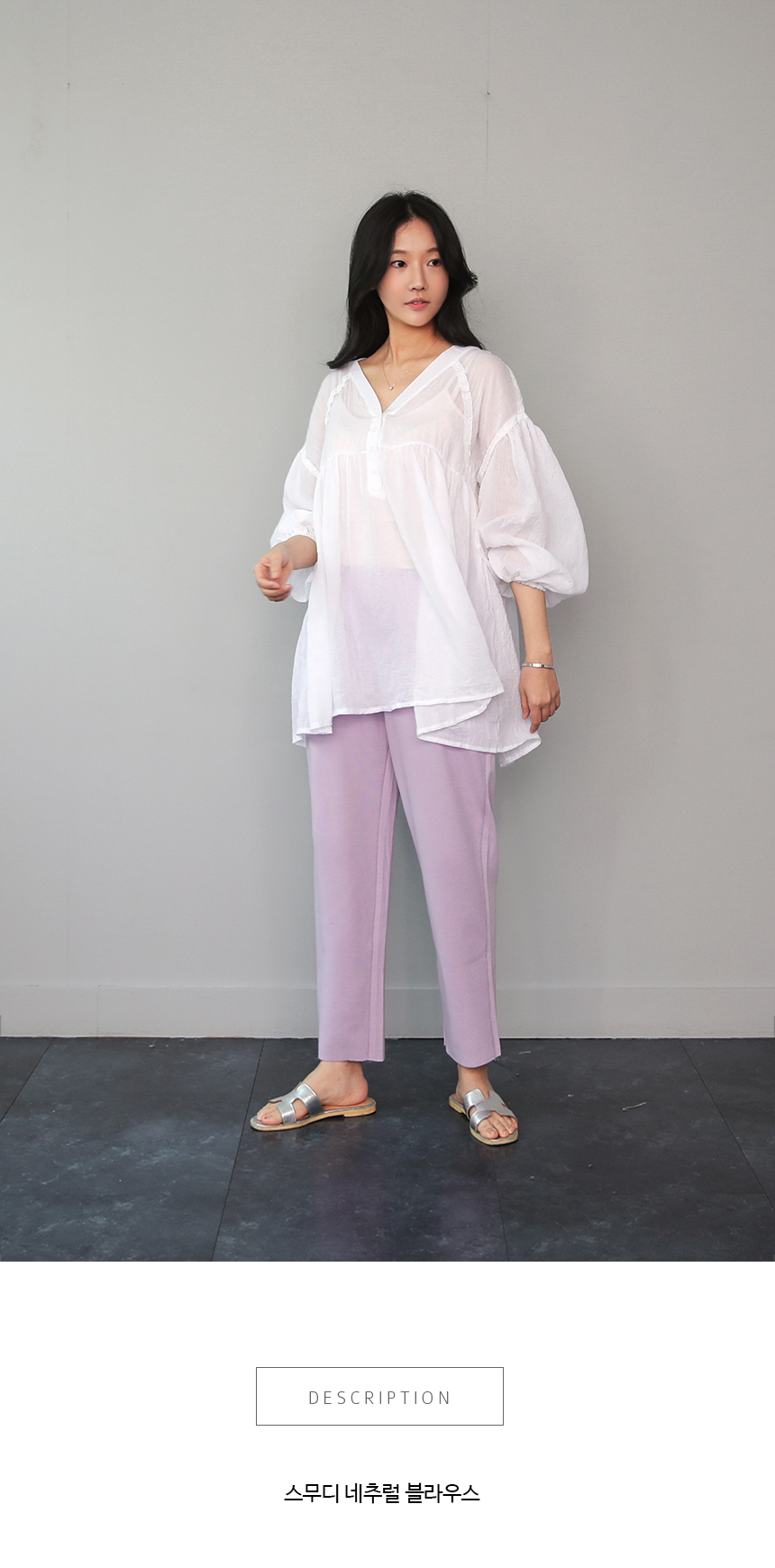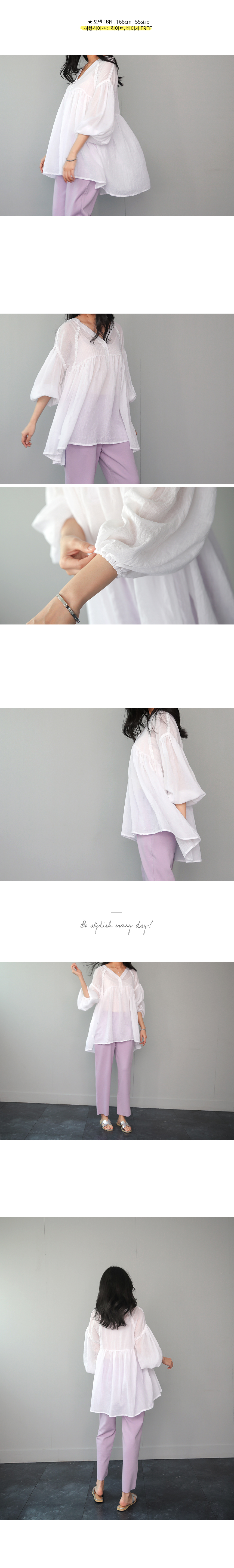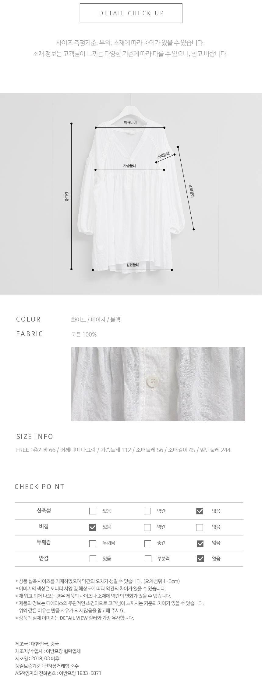 얇은 아사면 소재로 보들 보들 거즈처럼 촉감이 좋은 코튼 100% 소재감이 기분 좋은 네추럴한 무드의 퍼프 블라우스에요