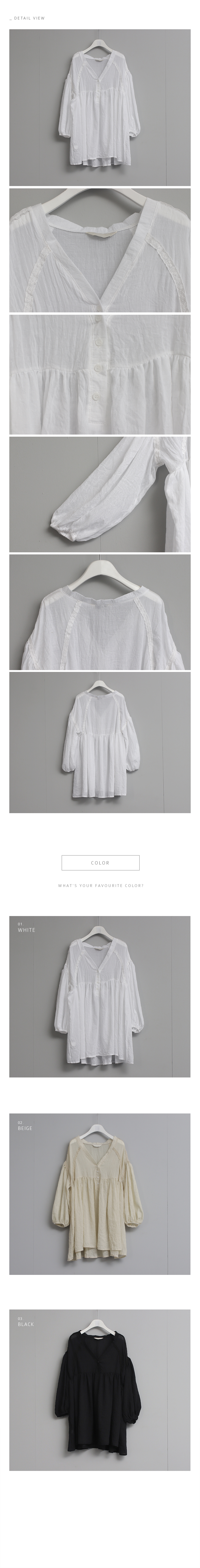 많이 내려온 어깨선에서 연결된 풍성한 퍼프 소매와 가슴선 아래로 풍성하게 잡은 플레어 라인의 스타일이 잘 어울려 데일리룩으로 리조트룩, 비키니 커버업등 다양하게 쓰일 아이템이랍니다 (※ 비침있는 소재로 모델은 스킨색 탑을 이너로 입어주었어요)