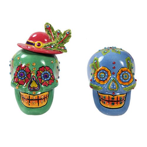 Day of Dead Sugar Blue & Green Skulls Salt & Pepper Shakers Set Rhinestone DOD by Pacific Giftware