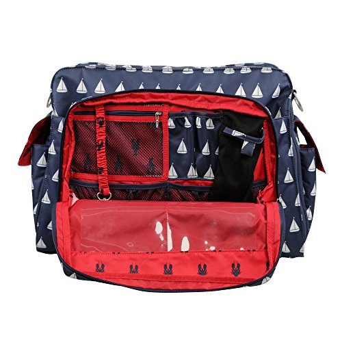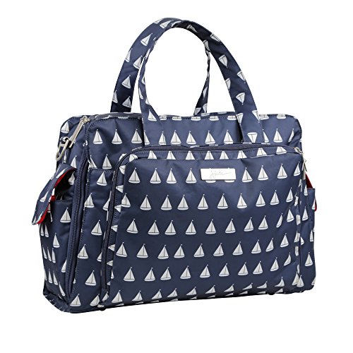 The Ju-Ju-Be Coastal Collection Be Prepared Diaper Bag is a smart bag with innovative designs and spacious compartments. Keep yourself ultra-organized with (17) friendly pockets that make it easy to tote along all your daily essentials. Are you an over packer? Do you have more than one in diapers? Twins? How about the perfect bag for overnight trips or the airplane? The largest in our line of diaper bags, the Be Prepared will help you be just that, prepared. The lining is protected with an Again natural antimicrobial treatment that inhibits and reduces the growth of odor-causing bacteria, mold and mildew. The outer fabric is treated with Teflon fabric protector, making it easy to repel stains and keep it clean. The "mommy" pocket is large enough for smartphones, wallets, keys and other personal items. Inside are (4) pockets with a sunglass holder and a key fob stretch cord. A snap closure pocket is located on the front of the bag and ideal for books. The main zipper pocket is large enough for diapers, wipes, extra clothes and other items. This spacious area also includes (7) smaller pockets with (2) sets of colored tabs to help distinguish different items. The back pocket is designed with crumb drains to keep this area clean and includes a super cushy memory foam changing pad. Bottle pockets with magnetic closure flaps are located on either side of the bag and insulated to keep items hot or cold. This bag is machine washable and measures 18.5-inches by 14-inches by 6.5-inches in size. The Annapolis print is white sailboats on a navy background with the Cape Cod print lining that is navy lobsters on a pink background. The print is accented by silver, metal hardware. All Ju-Ju-Be items come with a Lifetime Limited Warranty against manufacturing defects when purchased from an Authorized Ju-Ju-Be Dealer.Feature