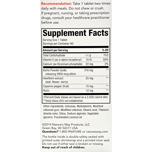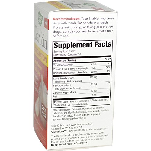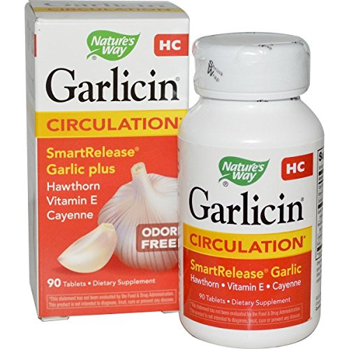 Studio : Natures Way Publisher : Natures Way Binding : Health and Beauty Product Description Stomach acid protection Rapid intestinal release Odor-free Garlic Garlicin (R) HC Healthy Circulation Formula combines all the effectiveness of high allicin release Garlicin (R) with the added benefits of Hawthorn extract, Cayenne and Vitamin E. Garlicin (R) HC is made from high quality, alliinase-rich garlic powder. Using the SmartRelease (R) tableting and enteric-coating technology exclusively developed by Natures Way, Garlicin (R) HC is guaranteed to have 100% stomach acid protection and rapid disintegration in the intestines. 0