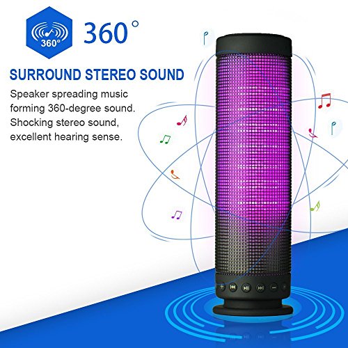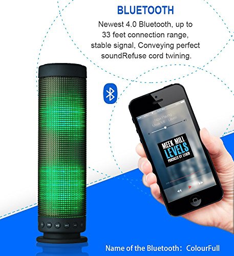 Feature : 360-Degree Surround Stereo Sound / Crystal Clear Deep Bass.Built-in programmable LED Lights that Pulse to Your Music / Light Pattern is Adjusted by the sound, Compact and Portable Speaker / Built-in High Sensitivity Microphone for Hand Free Call Function / Newest 4.0 Bluetooth, up to 33 Feet Connection Range