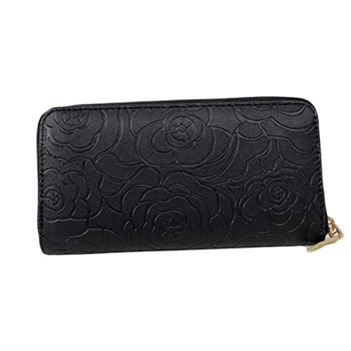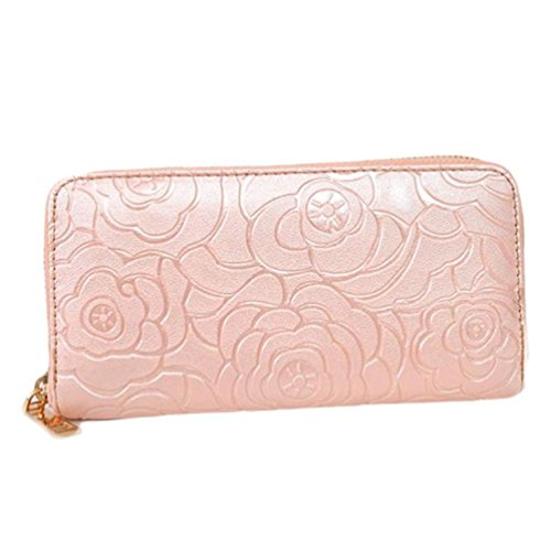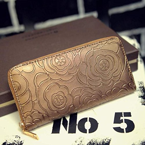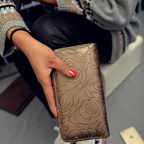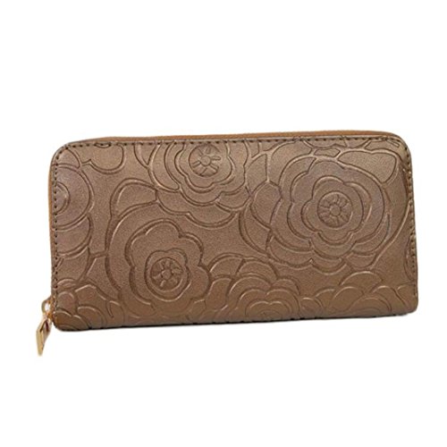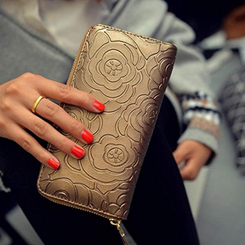 Tevies® Lady Women Rose Embossed Zipper Leather Clutch Wallet Long Card Wallet (Gold)