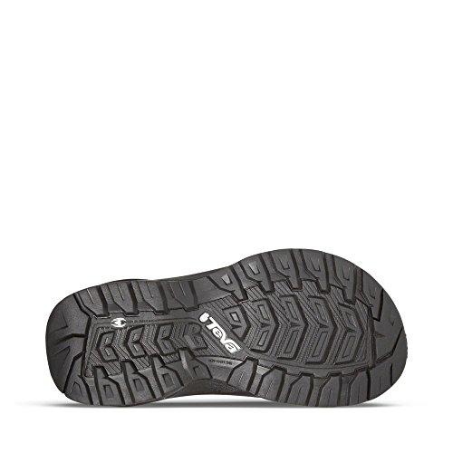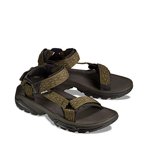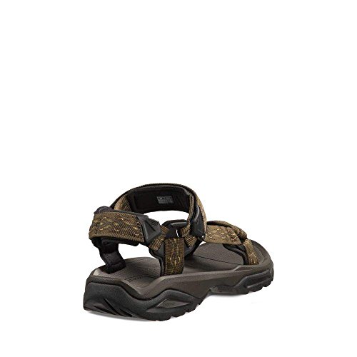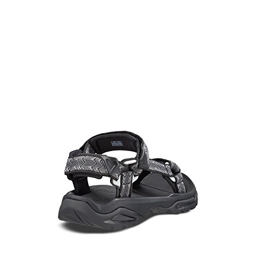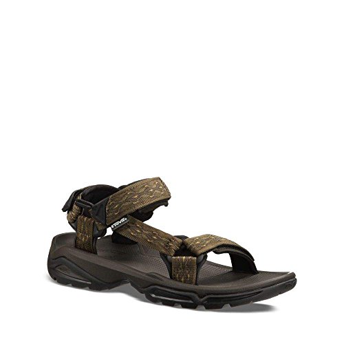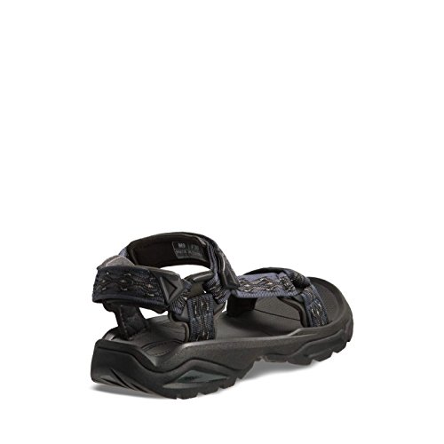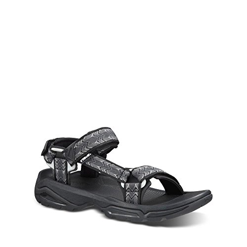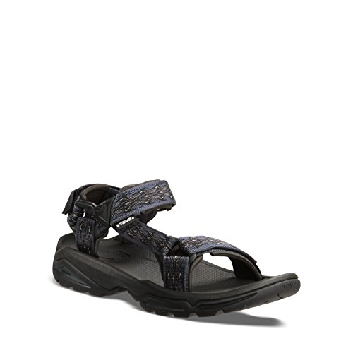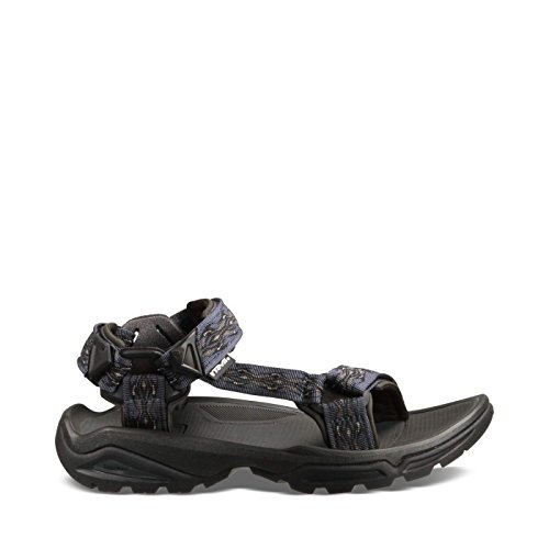 Sporty sandal featuring patterned webbing with adjustable hook-and-loop straps
