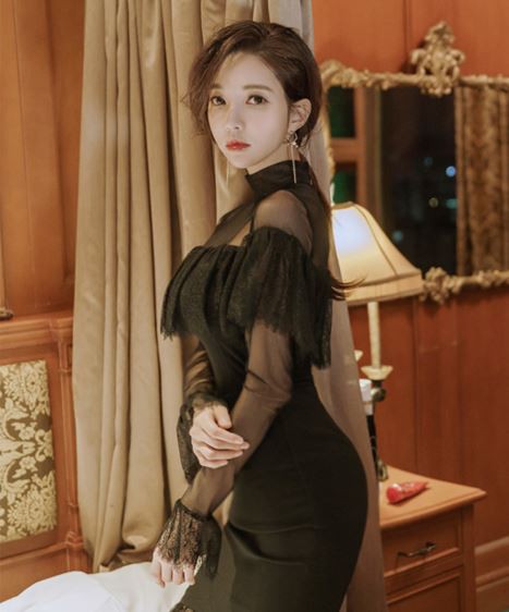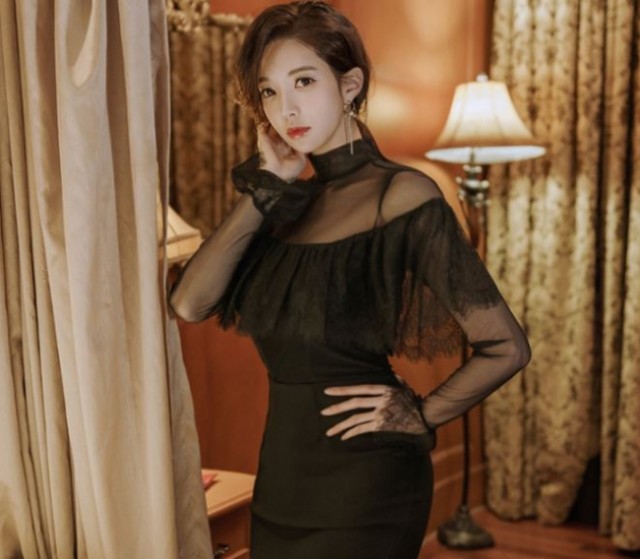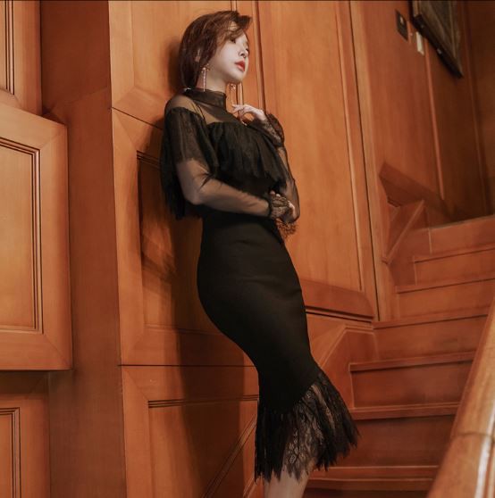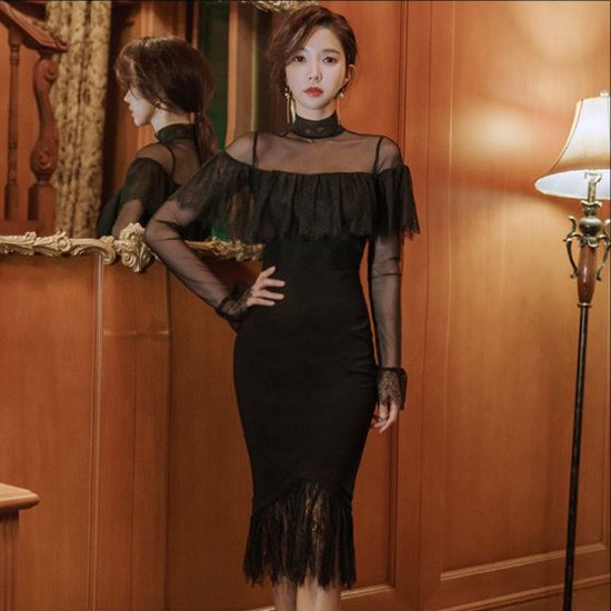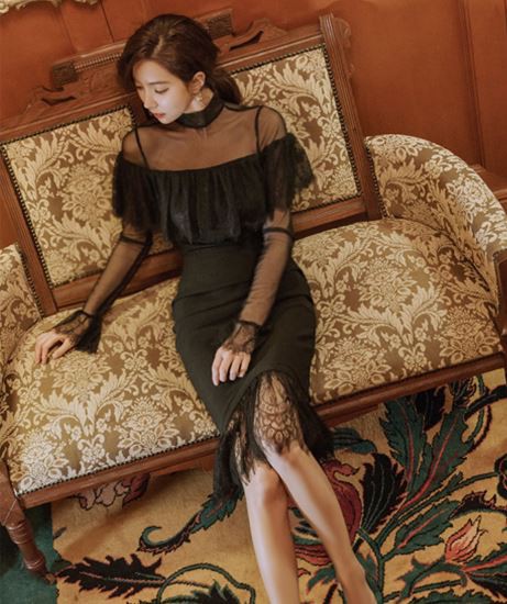 オフショルダー風の重ねレースが華やかなパーティードレスです。
