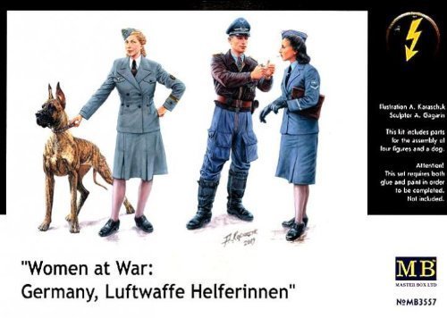 1/35 WWⅡ 独・空軍女子補助員2体+戦闘機搭乗員&大型犬 MB3557 ドイツ軍は戦争の長期化に伴い通信部隊などに補助要員として 女性を配備しました。制服を着た彼女らは前線の後方で様々な 任務に就き活躍したのでした。