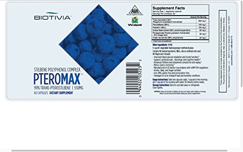 -. Binding : Health and Beauty -. Brand : Biotivia -. EAN : 0094922049025 -. Feature : SUPPORTS MEMORY: PteroMax supports memory and cognitive enhancement / WEIGHT CONTROL:Supports weight management, lean mass improvement, and boosts physical energy / POWERFUL: Pterostilbene is a Resveratrol cousin, also called an analog, found in blueberries. The combination enhances the bioavailability of Resveratrol for overall heart health, fitness, and cognitive support benefits / ANTIOXIDANTS: The complex of polyphenols in PteroMax is designed to mimic the distribution of these antioxidants in the grape and the Japanese Giant Knotweed / CERTIFIED VEGAN: Certified vegan by the American Vegetarian Association -. IsAdultProduct : 0 -. Label : Biotivia -. Manufacturer : Biotivia -. Model : BIO-PTERO-60 -. MPN : BIO-PTERO-60 -. NumberOfItems : 1 -. PackageQuantity : 1 -. PartNumber : BIO-PTERO-60 -. ProductGroup : Health and Beauty -. ProductTypeName : HEALTH_PERSONAL_CARE -. PublicationDate : 2011-09-12 -. Publisher : Biotivia -. Studio : Biotivia -. Title : Biotivia PteroMax, Advanced Trans- Resveratrol + Multi-Stilbene Supplement, 60 Count -. UPC : 094922049025