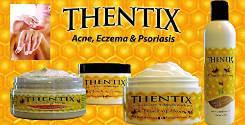 Thentix Skin Conditioner contains Pure Honey which helps promote the growth of healthy skin, faster healing & less scaring. Combined with Aloe Vera, Royal Jelly, Gingseng Extract, avocado Oil & other ingredients, this smooth silky cream hydrates the skin, providing quick relief from rashes, eczema, razor burn & psoriaris. Keeps body, hands & face well nourished & protected. "Thentix" A Touch of Honey is a natural skin conditioner that works great from head to toe! Encasing your skin like a glove and does not wash off with leaving a greasy feeling. A little goes along way! This healing all purpose product has been a miracle for those who suffer from very dry skin, chapped skin, sunburn, impetigo, radiation burns, cradle cap, poison ivy, hives, itching, inflamed joints, allergic rashes, varicose veins, ashy skin, abrasions, fungus, insect bites, flea bites, bed sores, diaper rash, shingles, edema, psoriasis, sore muscles, eczema, arthritis, acne, razor burn, athletes foot, wind burn, rough hands, stretch marks, poor circulation, derm-abrasion, x-ray burns, seborrhea and more! Ideal for pets too!