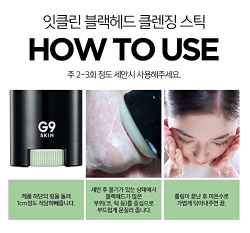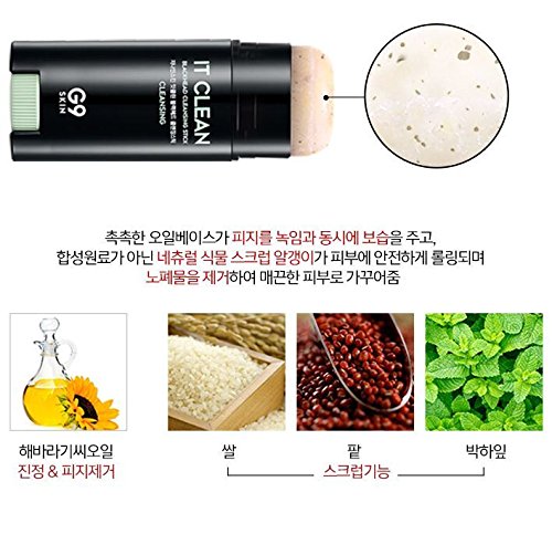 -. Feature : [G9SKIN] It Clean Blackhead Cleansing Stick / Removes blackhead + whitehead inner pore impurities gently and thoroughly. / Impurity + sebum care for clean pores, gives bright and high makeup absorbing skin. / Increase skin elasticity on saggy pores. / Moisture oil base melt sebum, natural plan scrub for safe use.