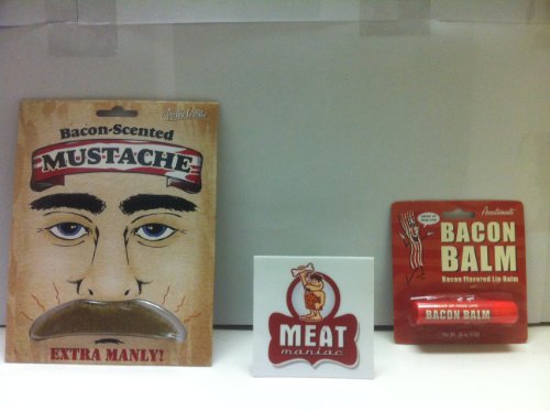 -. Feature : Meat Maniac Novelty Bacon Combo Gift Pack / 1- Bacon Lip Balm: bacon flavored lip balm keeps your lips moist and meaty. / 1- Bacon Scented Mustache: made of lifelike synthetic hair and smells like bacon. / 1- FREE MEAT MANIAC STICKER:) / Great Gift for ANY Occasion! Father's Day, Mother's Day, Valentines Day, B-Day, Christmas, Halloween or Easter