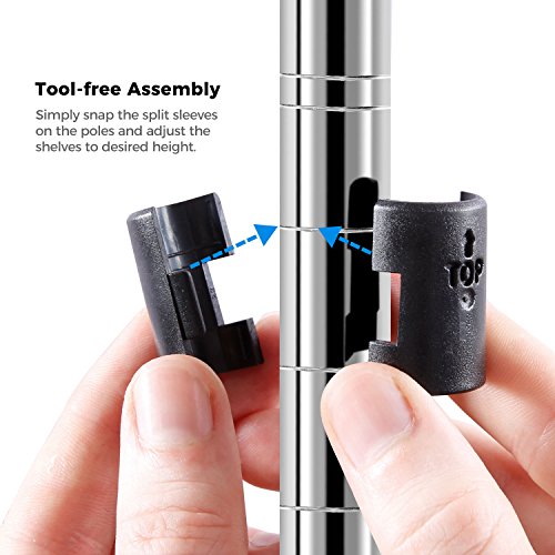 ADJUSTABLE HEIGHT: The storage rack allows you to adjust the height of the shelves to meet your different storage needs. Simply snap the split sleeves on the poles and adjust the shelves to desired height.