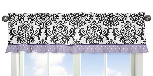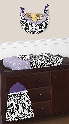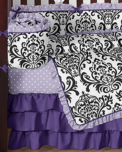 -. Feature : 9 Piece Set Includes: (1)Crib Blanket, (1)Bumper, (1)Fitted Sheet, (1)Skirt, (2)Window Valances, (1)Diaper Stacker, (1)Toy Bag and (1)Throw Pillow / **Sweet Jojo Designs also offers an 11 piece bumperless set / This set combines black and white damask, lavender and white polka dot, and solid purple cotton. / This set is made of 100% cotton and is machine washable / This design has matching accessories such as hampers, lamp shades, window treatments and wall decor