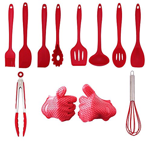 -. Feature : Attention please!Heat resistant up to 460℉.Please don't put the sets under high temperature over 460℉ for a long time or prevent direct open fire. / Utensil Set of 12 Pcs:Leakage Spade,Large Spatula,Small Spatula,Basting Brush,Whisk,Spoon,Leakeage Spoonful,Pasta Server,Tong,Butter Spatula,Barbecue Glove,cover all kitchen needs for your everyday cooking , make the kitchen more interesting. / Food Grade Quality Set.Strong and sturdy are great for holders of all types of batter.Perfectly curved and contoured for easy grip to help you be the best chef you can be. / Spatula set can be used for home cooking uses such as serving pie, mixing cake batter or grilling your favorite barbeque foods. / Light to Handlle and angled to cook easily and for mixing things such as brownie and cake batter. Better than plastic, stainless steel or mini, scissors type, or wooden spatulas. Perfect for your favorite holiday!