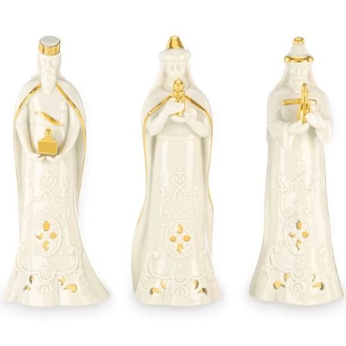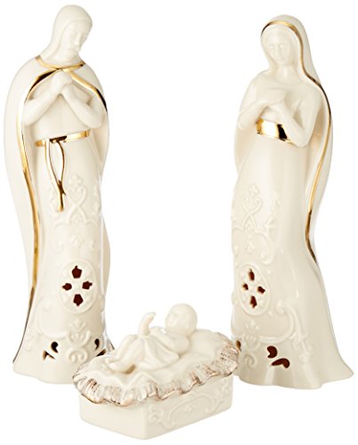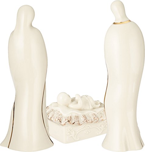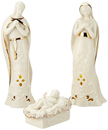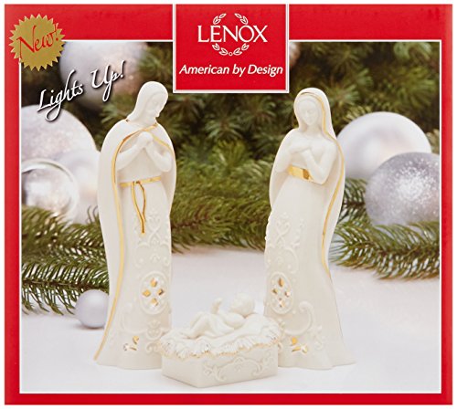 Lenox offers timeless designs that have been a treasured part of American holidays for generations. Unmatched quality and hand craftsmanship result in exquisite pieces that bring a special glow to your home. No other gift expresses the joy of the season more than specially-chosen Lenox collectibles for the people who you cherish most. Best of all, these products are created by Lenox, the name more closely associated with holiday entertaining than any other. The confidence that Lenox has in the unmatched durability of every item they offer is backed up by a lifetime breakage replacement policy to guarantee many years of enjoyment to each customer. The story of the first Christmas glows with a warm light from the Holy Family lighted ivory porcelain figurines. This hand-painted, 3-piece set of Mary, Joseph, and the baby Jesus is lavishly accented with gold and shines with an LED light. Batteries are included.Feature
