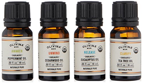 One each Awaken (peppermint oil), Unwind (cedarwood oil), Release (eucalyptus oil), and Clarify (tea tree oil).