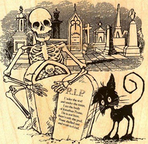 -. Title : {Single Count} Unique & Custom (4" Inches) "Spooky Halloween Graveyard Tomb Skeleton Scraggly Cat Scene" Square Shaped Genuine Wood Mounted Rubber Inking Stamp