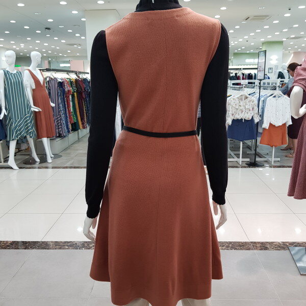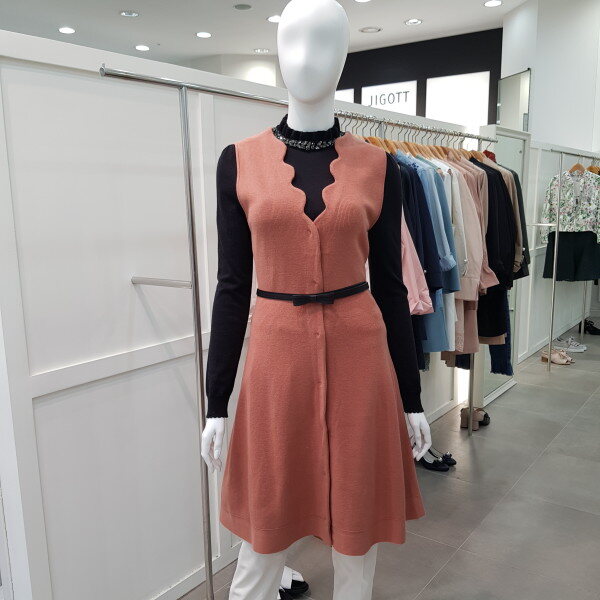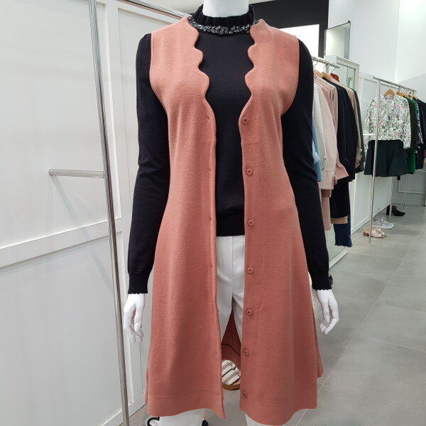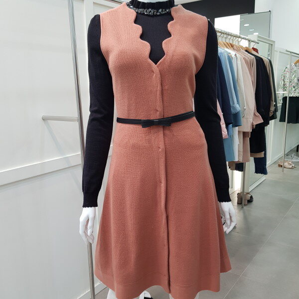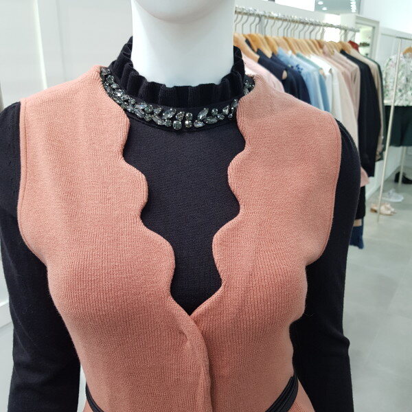 네크라인의 스칼렙 디테일이 귀여운 핏앤플레어 베스트.이너 착용후 전체 닫아 원피스로도 가능한 스타일