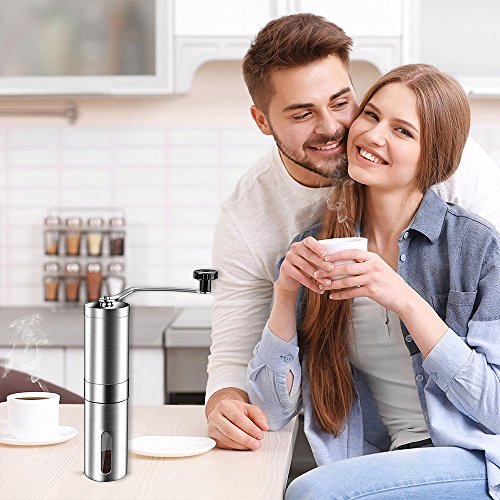 ◆Convenient and Noiseless-- Convenient removeable hand crank mechanism consistently eliminates over 90% of the noise that electric grinders produce. Imagine grinding your favorite java roast quietly in an office cubicle or in your kitchen when your loved ones are fast asleep.