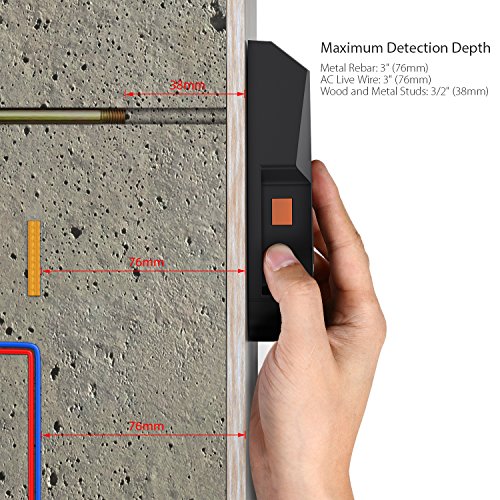 - Three Detecting Modes: During the stud sensor mode, it can locate the the edges of wood or metal studs up to 3/2" (38mm), metal rebar up to 3"(76mm) and AC wire up to 2"(51mm).