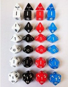 Die types: 4, 6, 8, 10 (0 to 9) (10-90), 12, 20