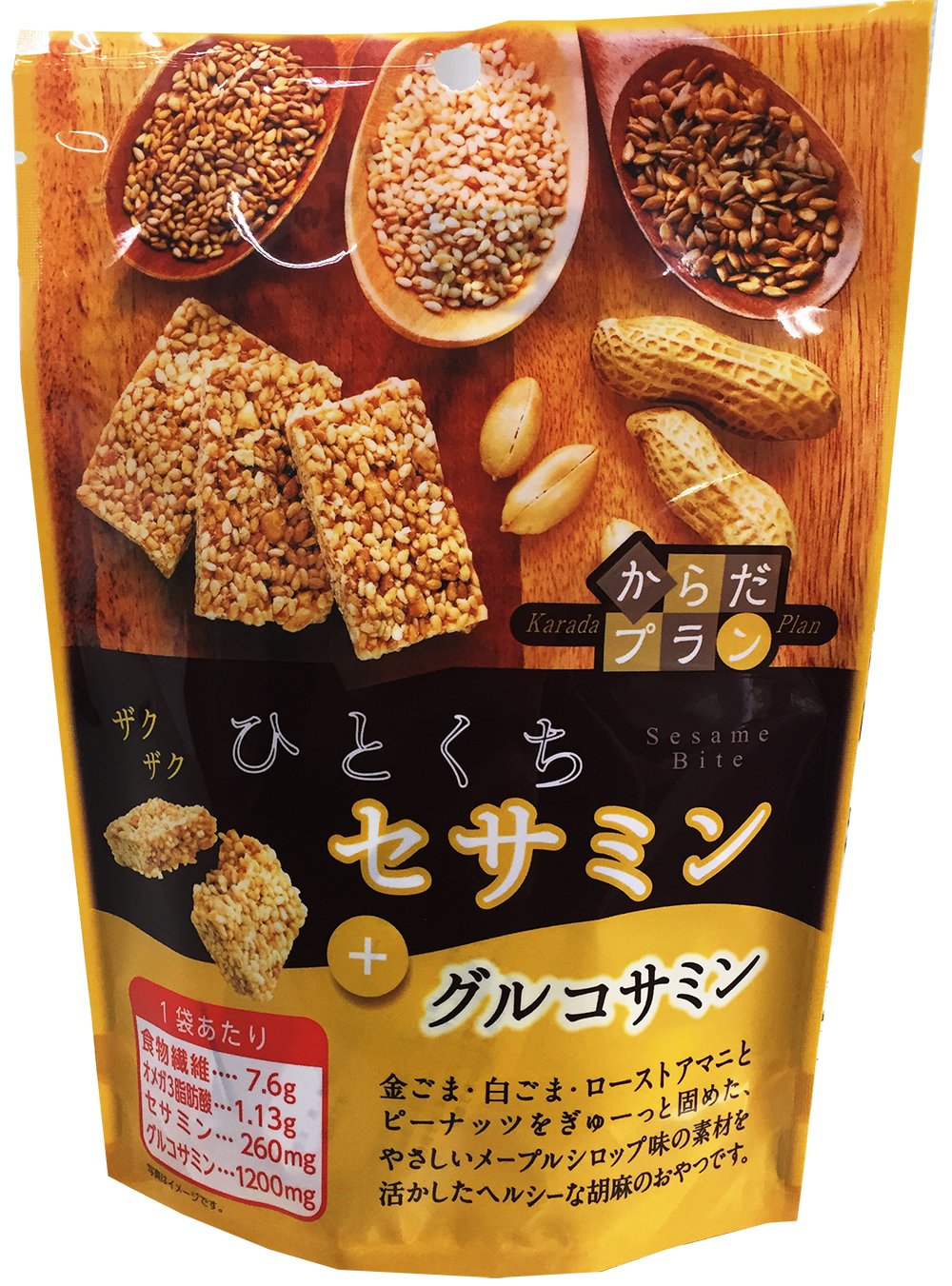 Per 100 g: Energy 672 Kcal Protein 18.1 g Lipid 46.2 g Carbohydrate 42.1 g Dietary fiber 7.6 g Sodium 71 mg (salt 0.2 g) Omega 3 fatty acid 1.13 g Sesamin 260 mg Glucosamine 1200 mg