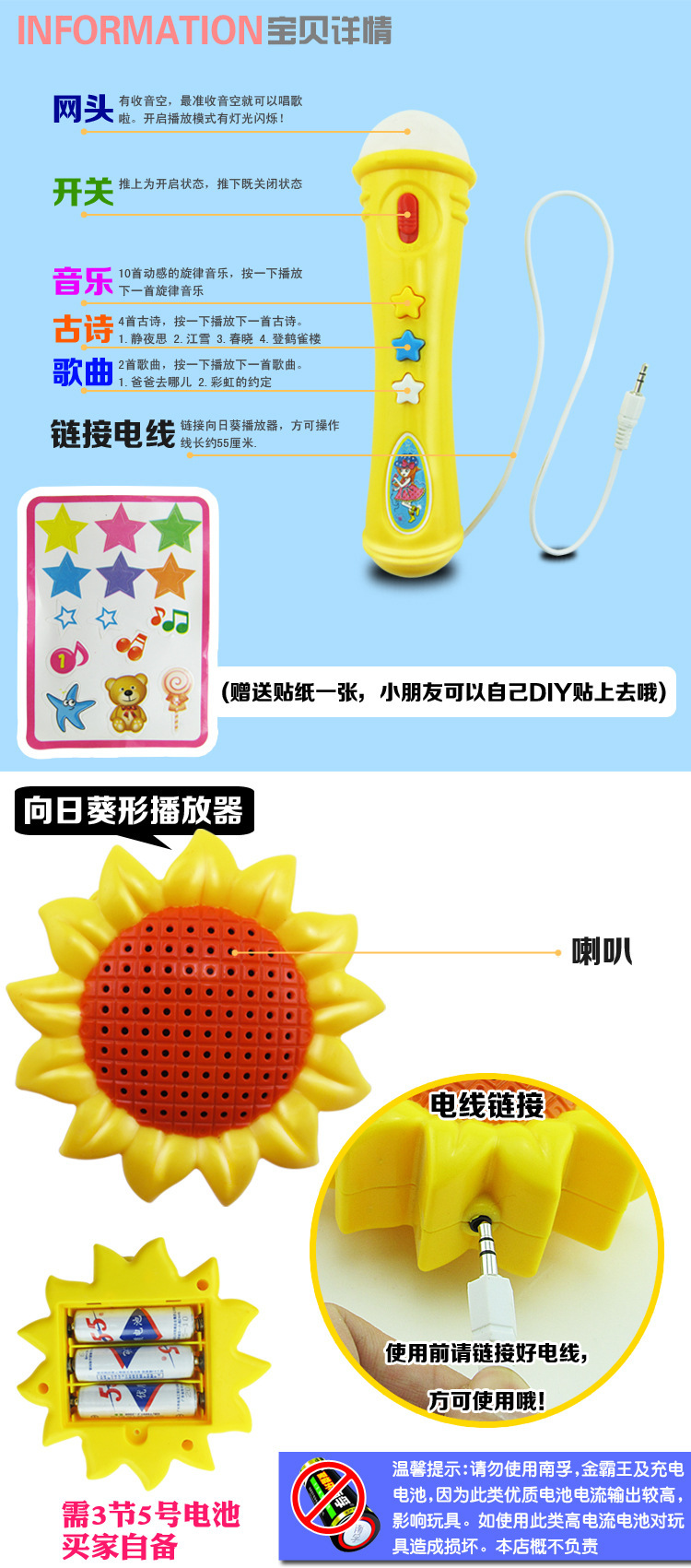[product description] this product matching microphone and speakers, can let the baby when a happy little singer, singing at ease for you to listen to, and not noisy others. From the baby was born to hear the sound, music is the child's mental development of the set sail, is the basis for training exchanges.