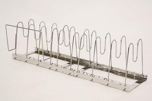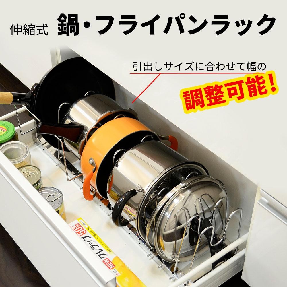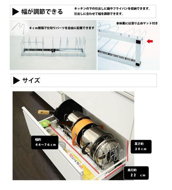 | 引出しサイズに合わせて幅が調整可能なフライパンラック。 |