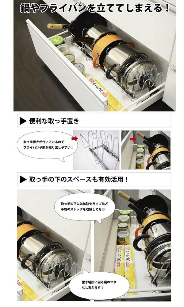 | 鍋やフライパンを立てたまま仕舞えるフライパンラック。4cm間隔で仕切りパーツを自由に配置できます。伸縮式なので引出しサイズに合わせて幅が調節可能です。取っ手置きが付いているので、フライパンや鍋が楽々取り出せます♪ |