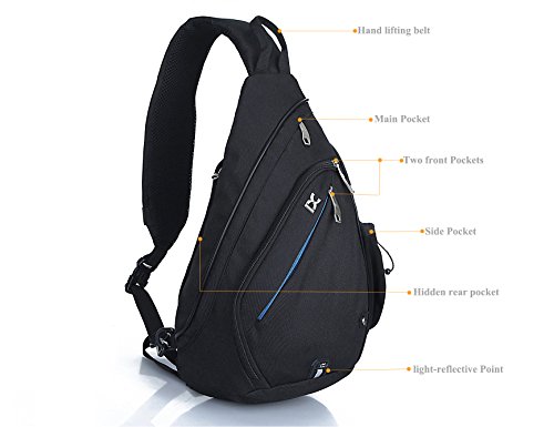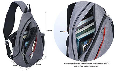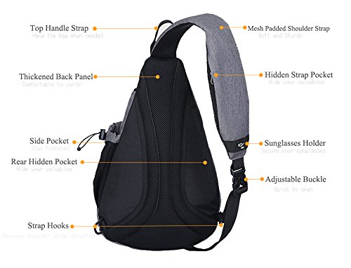 -. Feature : DURABLE AND SPACIOUS SLING BAG: Made of high quality water resistant nylon material,with abrasion resistant metal zipper.Reinforced design. / MULTIPLE POCKETS: Two zippered main pockets, two small zippered pockets(front and rear pocket), one strap pocket and one side mesh pocket. Provids enough space to store your items. Room for tablet or small laptop (up to 12").Perfect as book bag. / COMFORTABLE SHOULDER STRAP: The adjustable shoulder strap are well padded. The reversible strap direction can be changed accordingly,to fit most people with comfort and flexibility. / ANTI-THEFT POCKET: Equipped with two hidden anti-theft pocket(rear pocket and trap pocket) to secure your valuable stuff, like cellphone,passport,wallet, keys,ID card etc. / MULTI-APPLICATIONS.Stylish, multi-function and practical design. Perfect for casual outdoor activities,like hiking,camping,climbing,cycling,day trip,travel,school and shopping.