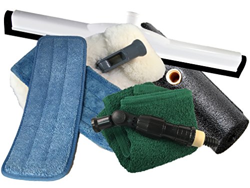 -. Feature : 9" Lambswool Wash on real leather backing with 4-way swivel pad holder / Angle Adapter to help clean roof, slideouts and around awnings / EZE Squeegee for quick drying and bulk water removal on fiberglass / 9" Cleaning Head with 100% Cotton Terry Towel for final drying / Microfiber Window Wizard works excellent on bugs and road grime