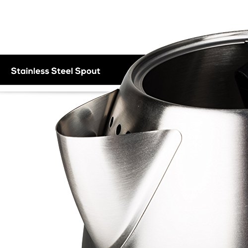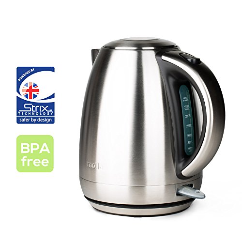 The Molla Contento Stainless Steel Water Kettle is made with the ideal material for water kettles - stainless steel. We use premium food grade stainless steel to make the Contento. Because the body and spout are stainless steel, the Contento is safe and ultra durable. It also has a generous soft brushed stainless steel surface and looks great in any room. The Contento is ETL Listed, meaning it has been extensively tested and certified for safety. The heating element is concealed beyond the stainless steel bottom. All materials in direct contact with water are BPA free. Easy to use - just flip the on and off switch to boil. The LED light on the switch illuminates while heating. The Contento switches off automatically once water is boiling or when the switch is manually flipped off. We use reliable and dependable advanced water kettle controls made by Strix, the leading water kettle control manufacturer. For your safety, the Contento automatically switches off when water boils, when it is lifted from the base, and when the mutli-sensor boil-dry protection detects the water level is low. The Contento features a generous 1.7L (7 cup) capacity with a large water level display. Fast boiling lets you enjoy your beverage in just about 7 minutes in full capacity. Cordless design gives you the freedom of picking it up and carrying it wherever you need to enjoy or serve your favorite beverages.Feature